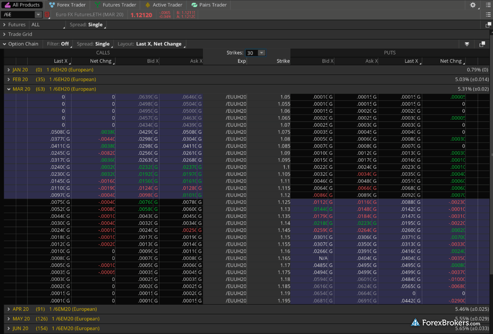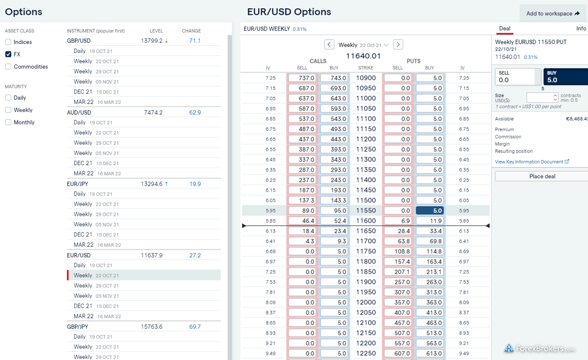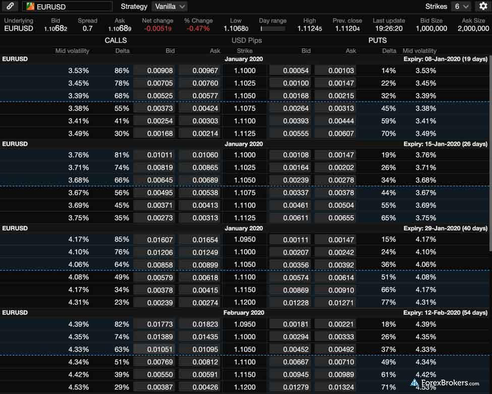 IG is my pick for the best forex broker for options trading. IG offers exchange-traded as well as off-exchange (over-the-counter) options across a number of global marketplaces, as well as Turbos and other exotic options that cater to a wide variety of investor risk appetites. IG offers exchange-traded options in the U.S. through its TastyTrade subsidiary. In the EU, IG operates a Multilateral Trading Facility (MTF) for its exchange-traded forex options. It’s also worth noting that the off-exchange OTC options available at IG feature versatile contract sizes (compared to the standardized contracts you’ll find on exchanges).